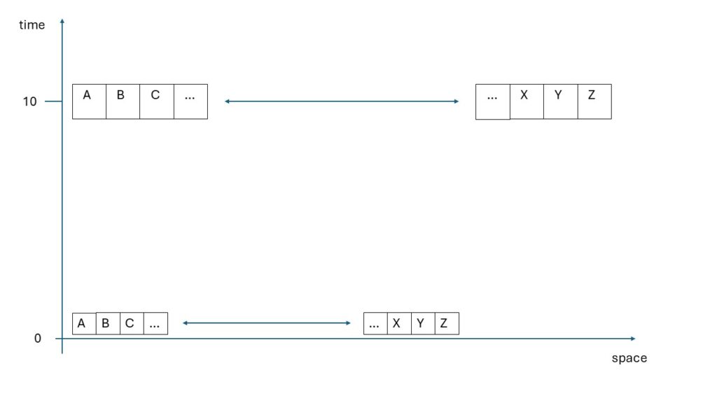 Due to the continuum, time also speeds up for each letter on the line. Time relaxation is a faster passage of time. This means that the passage of time is identical in each letter. There is no difference in the passage of time from one letter to the next. The crucial thing, however, is that we want to query the new distance at R(10) at point A. The change has already been incorporated into the time parameter 10. These are no longer the identical 10 seconds as at t = 0. However, we cannot determine this. The definition of time has changed. 10 time units are 10 time units for every letter on the route.