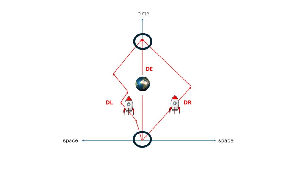 There is a triplet on the left (DL), a triplet on the right (DR), and a triplet on Earth (DE). DR has a single destination, while DL visits several locations. DE remains on Earth and only moves forward in time. What may not be 100% clear in the image is that the total distance traveled by DL and DR should be identical.
