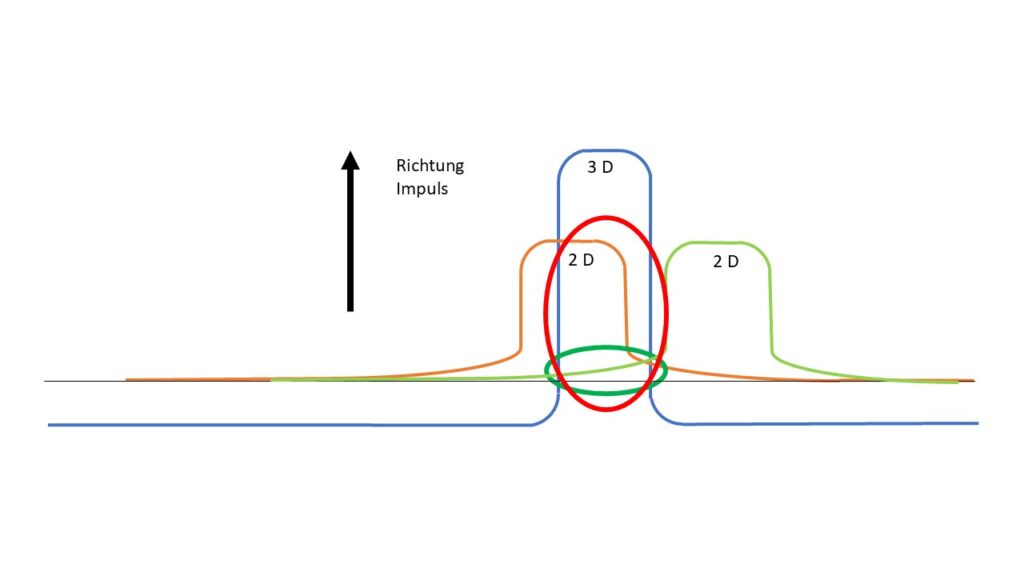 In dem Bild erkennen wir, wo die Überschneidung in der 3D Raumzeitdichte am größten ist. Dort wird das Teilchen im Mittel, über eine Wechselwirkung aus 2D heraus, am häufigsten anzutreffen sein. Je größer der Unterschied der Wellenamplitude, desto geringer ist die Wahrscheinlichkeit. Da bei einem Objekt, wie einem Menschen, die Amplitude der Raumzeitdichte in 3D ca. um den Faktor größer ausfällt als bei einem Elektron, ist eine Abweichung mit null gleichzusetzen. Daher erkennen wir im Alltagsleben nur eine Klassische Mechanik und keine Quantenmechanik.